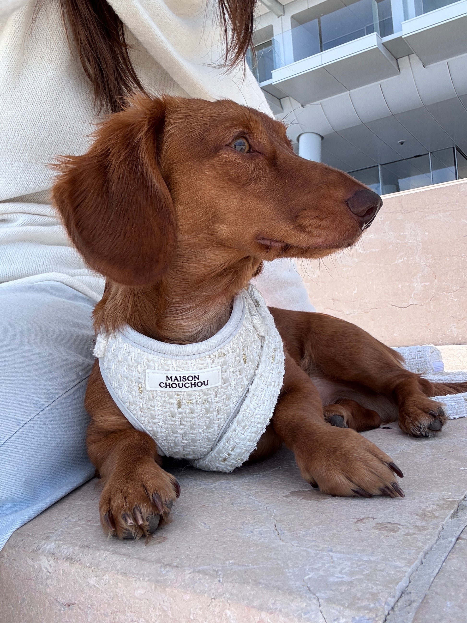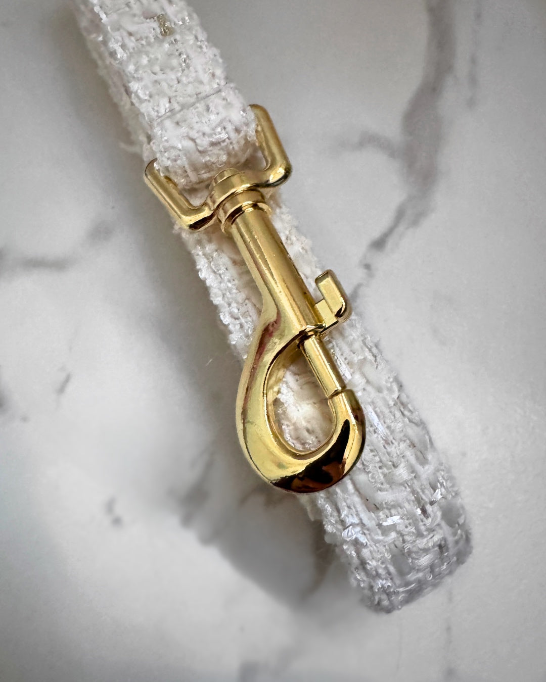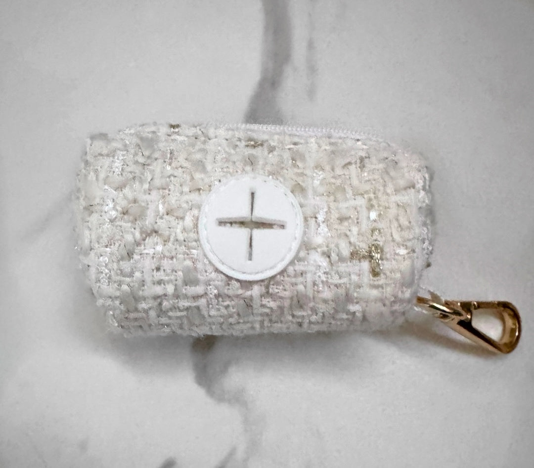 The Céleste Bundle unites sophistication and subtle glamour with the complete Céleste set — including the Harness, Leash, and Poop Bag Holder. Crafted from exquisite white tweed woven with fine gold threads, each piece embodies the quiet luxury and refinement that define Maison Chouchou.