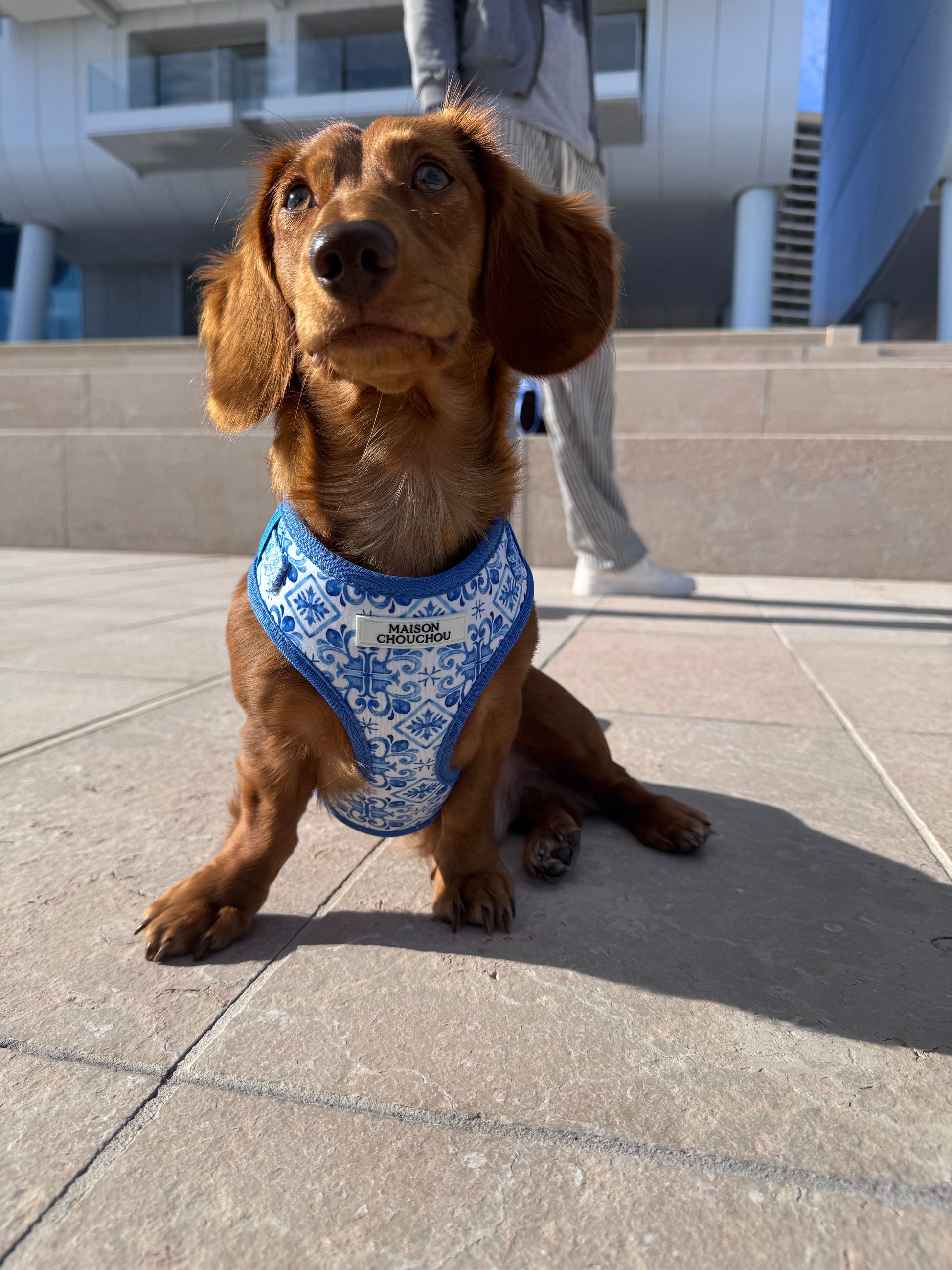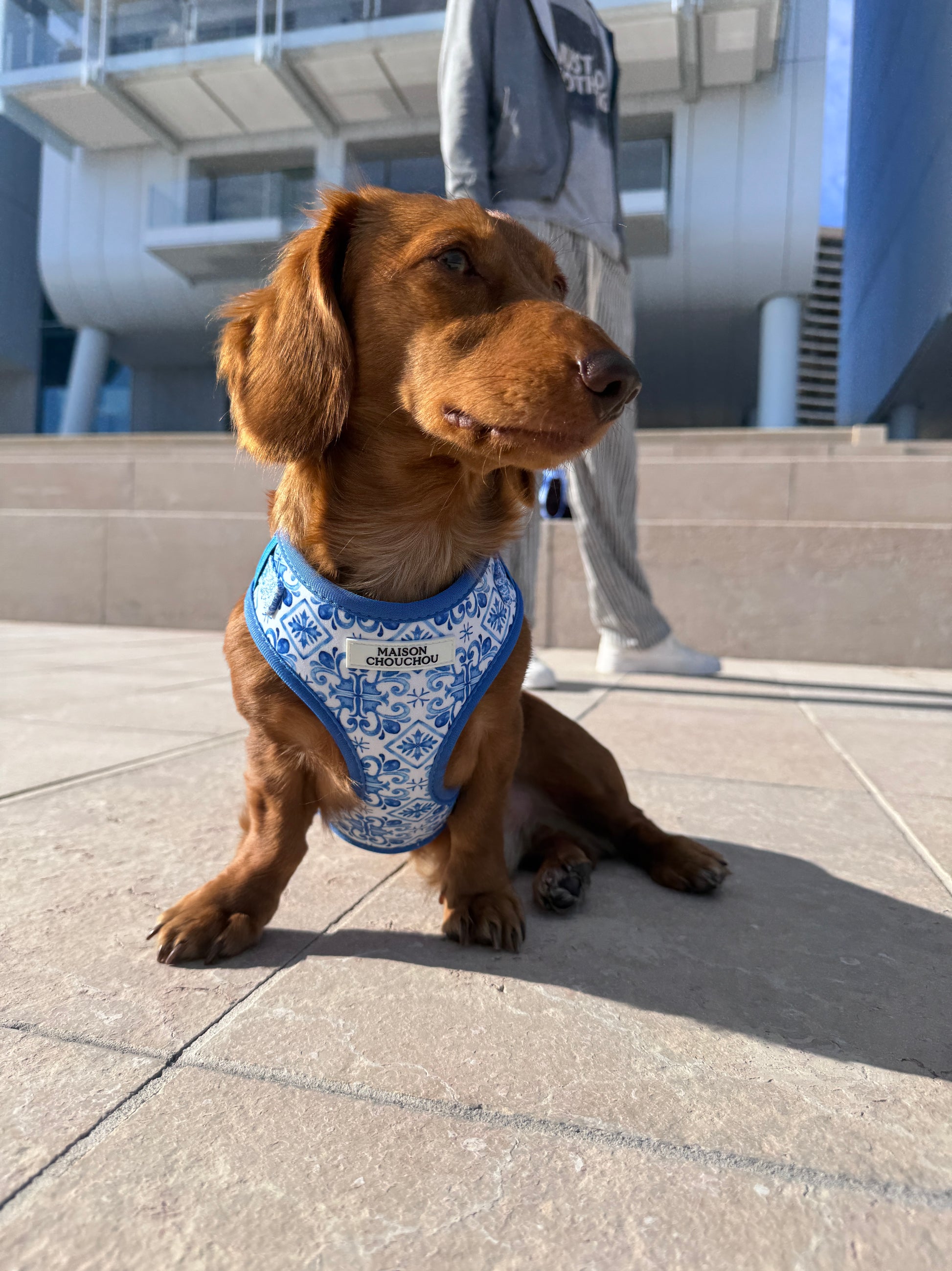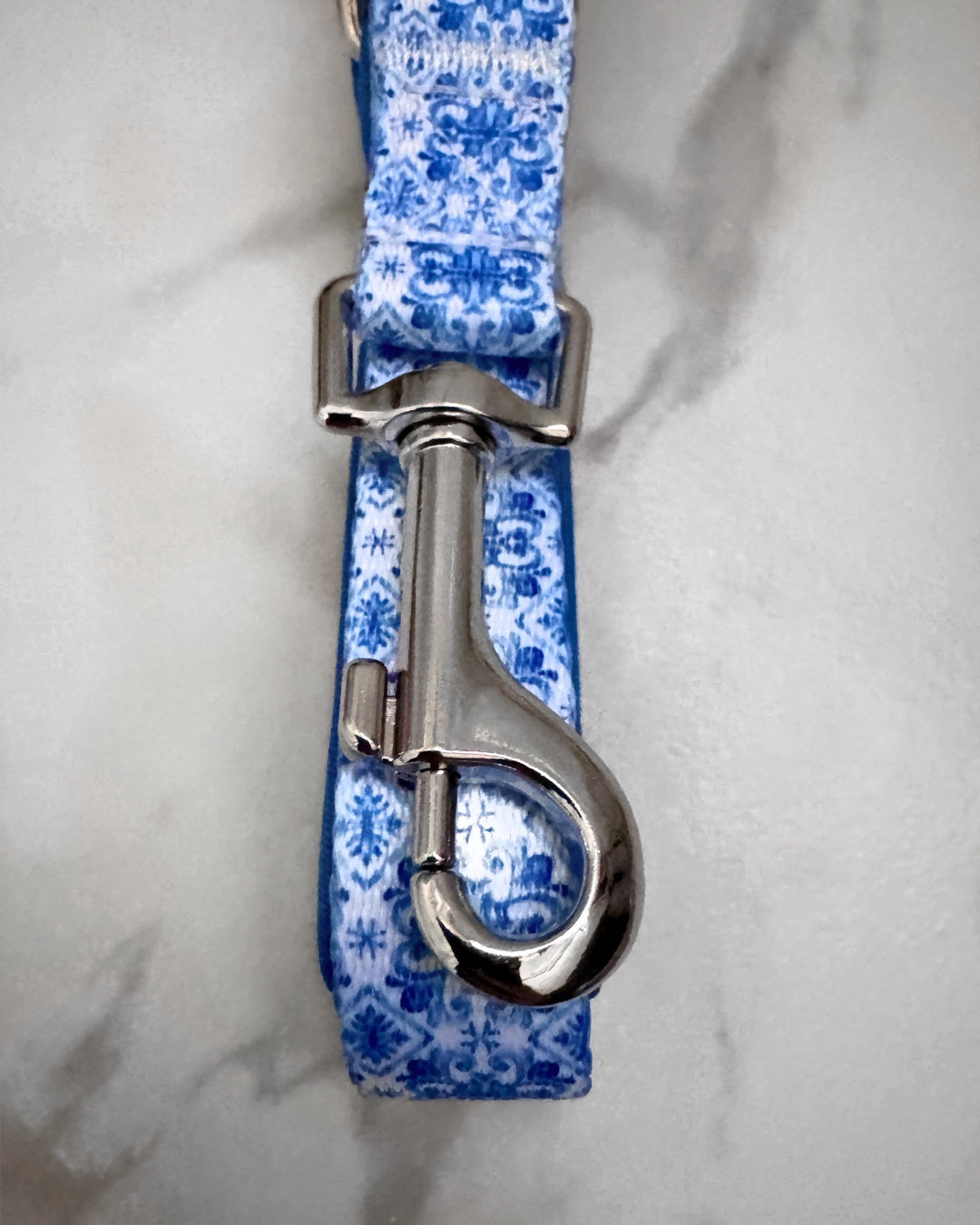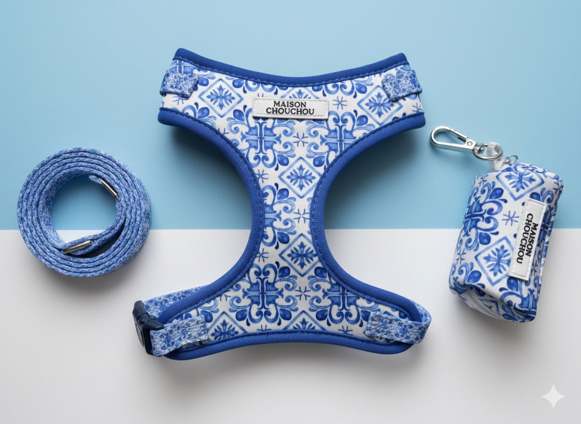 The Stella Bundle brings together the complete Riviera look — featuring the Stella Harness, matching Leash, and Poop Bag Holder. Inspired by the timeless beauty of Mediterranean tiles, its soft blue-and-white pattern captures the essence of coastal sophistication.